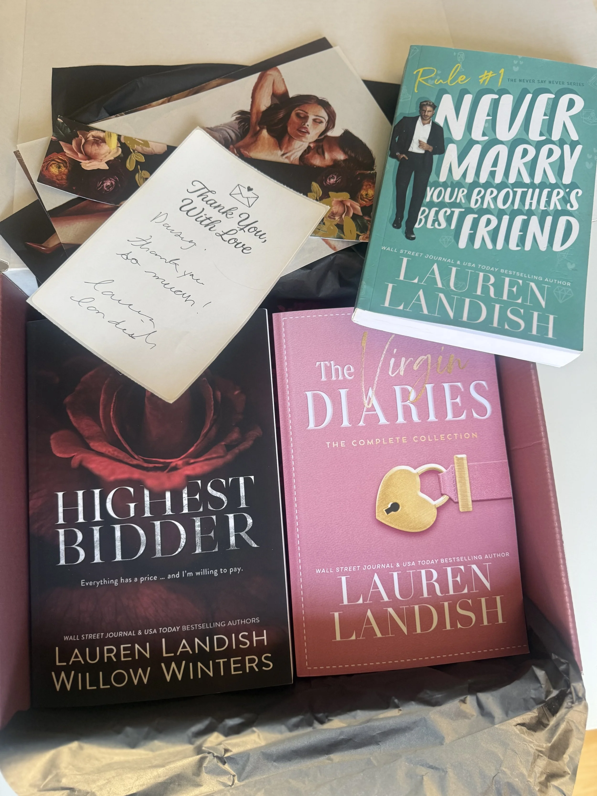 Want a Signed Copy of One of my Stories?Order them below! Autographed Books & Merch Quick View The Rose Book Box Collection $49.99 Quick View Highest Bidder (Rose Edition) + T-Shirt Bundle $65.00 Quick View Signed Paperback - Lauren Landish Collection $20.00 Quick View Highest Bidder Collection Special Edition Hardback $99.99 Sold out Quick View Highest Bidder Box Set Hardback (Rose) with Red Sprayed Edge $48.00 Quick View Highest Bidder T-Shirt $20.00 Quick View Lauren Landish T-Shirt $20.00 Quick View Beauty and the Billionaire Special Edition $90.00 Sold out Quick View Pushing Boundaries Special Edition $90.00 Quick View Never Say Never Series Paperbacks (6) $120.00 Quick View The Virgin Diaries Special Edition Hardback $60.00 Quick View My Big Fat Fake Wedding Special Edition $90.00 Quick View Never Marry Your Brother's Best Friend Special Edition $55.00 Quick View The Tannen Boys $85.00 Sold out
